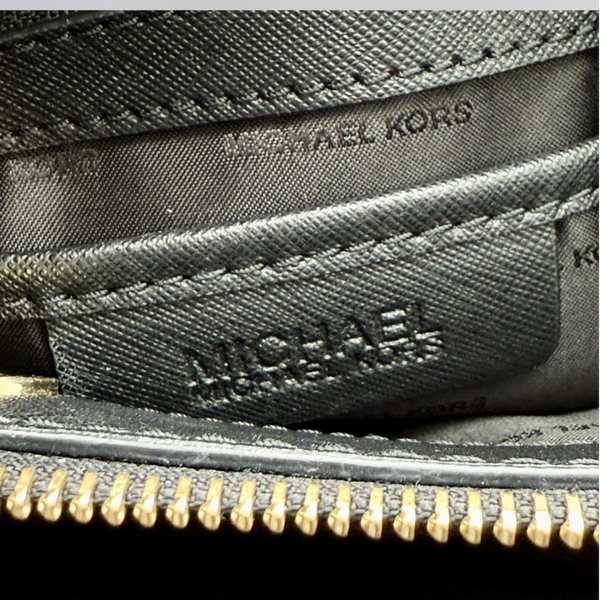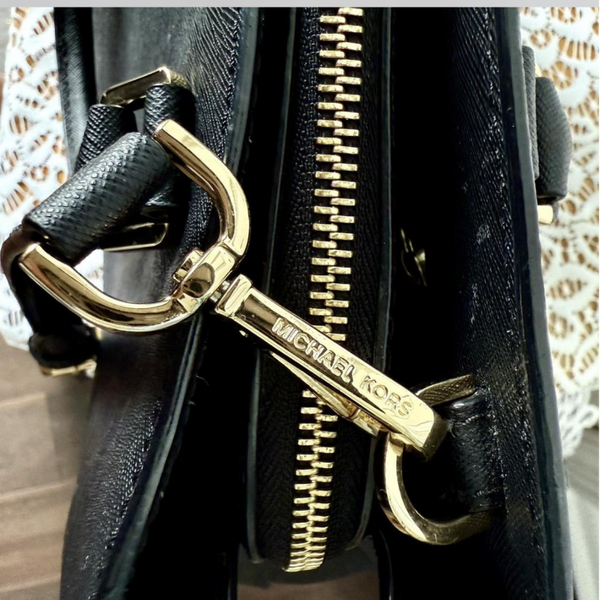 Made of rich Saffiano leather with gold tone hardware and an abundance of pockets. 10" L X 14"W X 6" H. Center zip compartment, 2 open compartments, 3 open pockets, zip pocket key fob snap holder, protective gold toned feet with some scuffing. Main compartments have magnetic snap closure. Slip your arm through the top handles or attach the adjustable shoulder strap (21"-24"). This adds luxe to any outfit! Excellent condition.